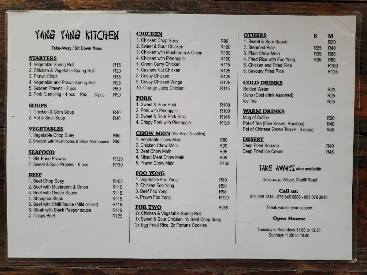 Yang Yang Kitchen in East London, South Africa, offers a diverse and flavorful menu that caters to both traditional and contemporary tastes. Among the standout dishes, the Chicken and Corn Soup provides a comforting start, with a warm, savory broth paired with tender chicken and sweet corn. It’s a delightful choice for those looking for something light yet satisfying.